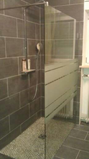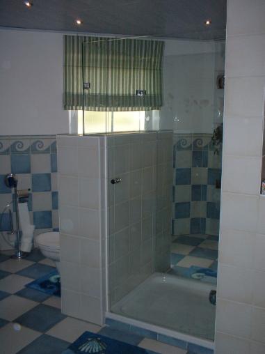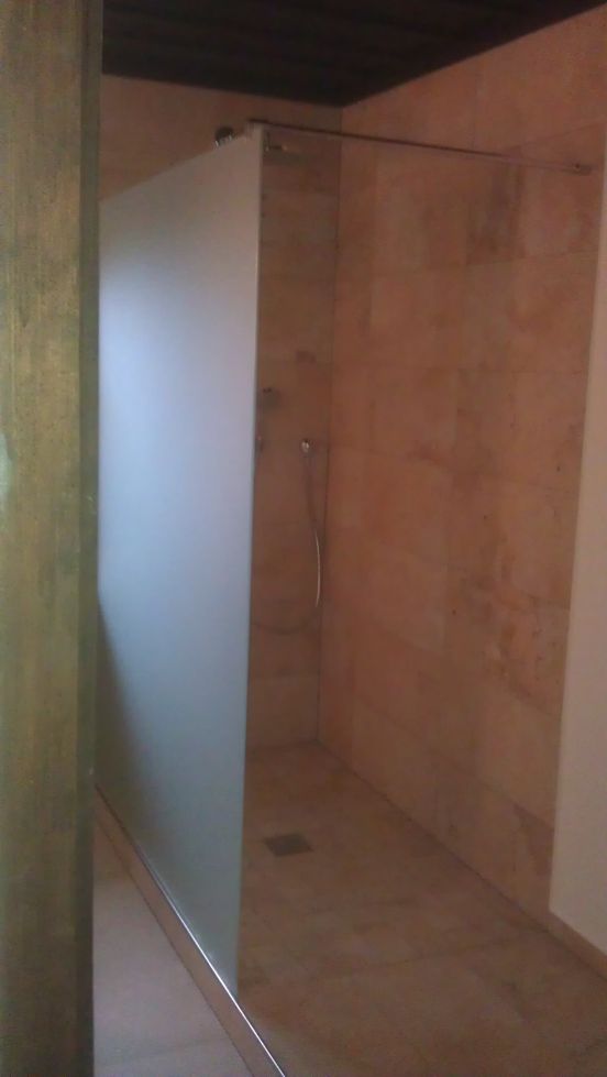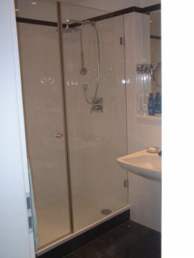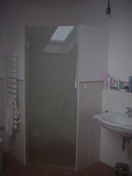 Eine zweiteilige Dusche. Hier kann man ungehindert mit einem Gummiabzieher die Dusche leicht reinigen!
